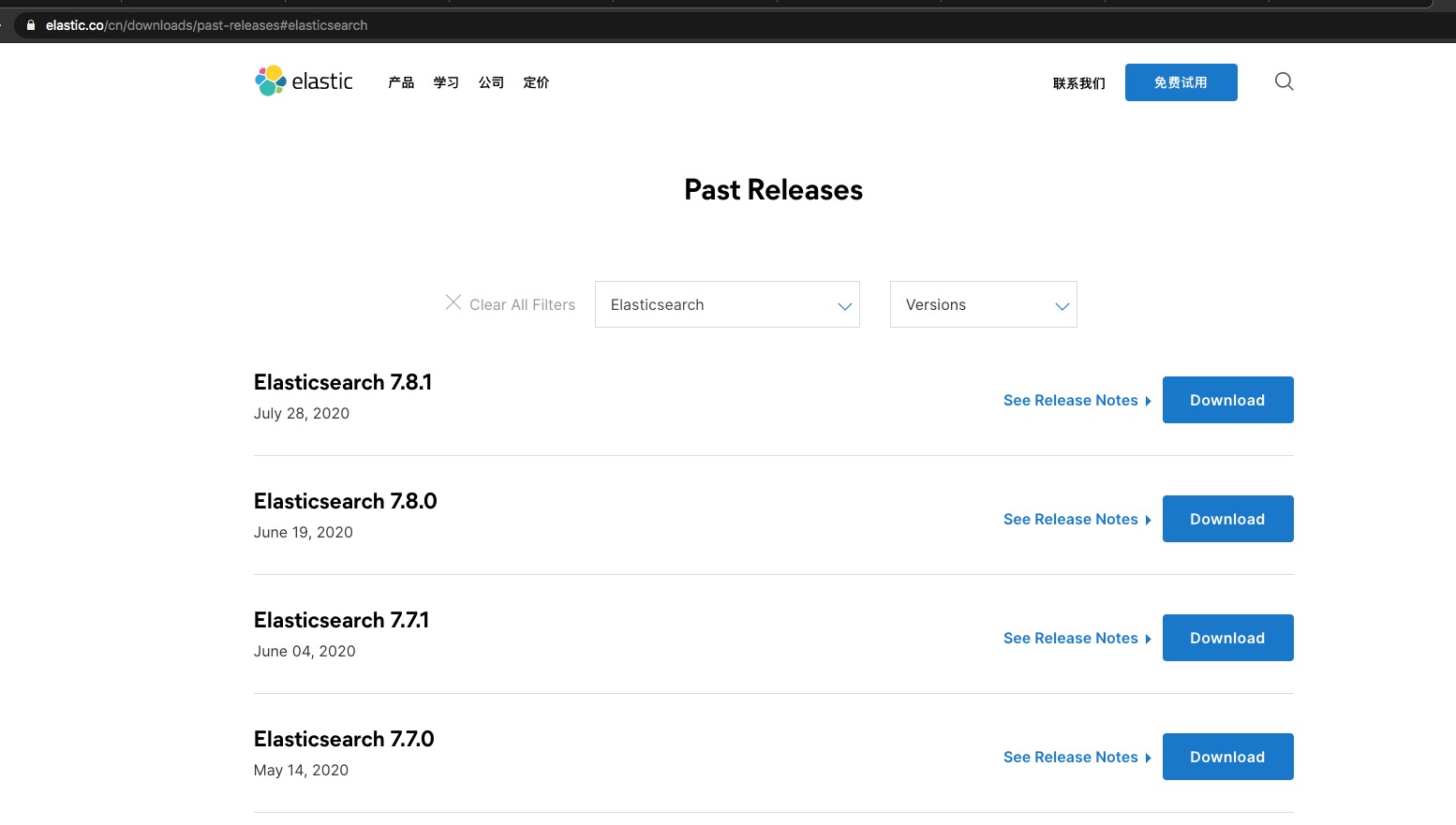 我们进入elasticsearch官网地址https://www.elastic.co/downloads/past-releases下载对应版本
